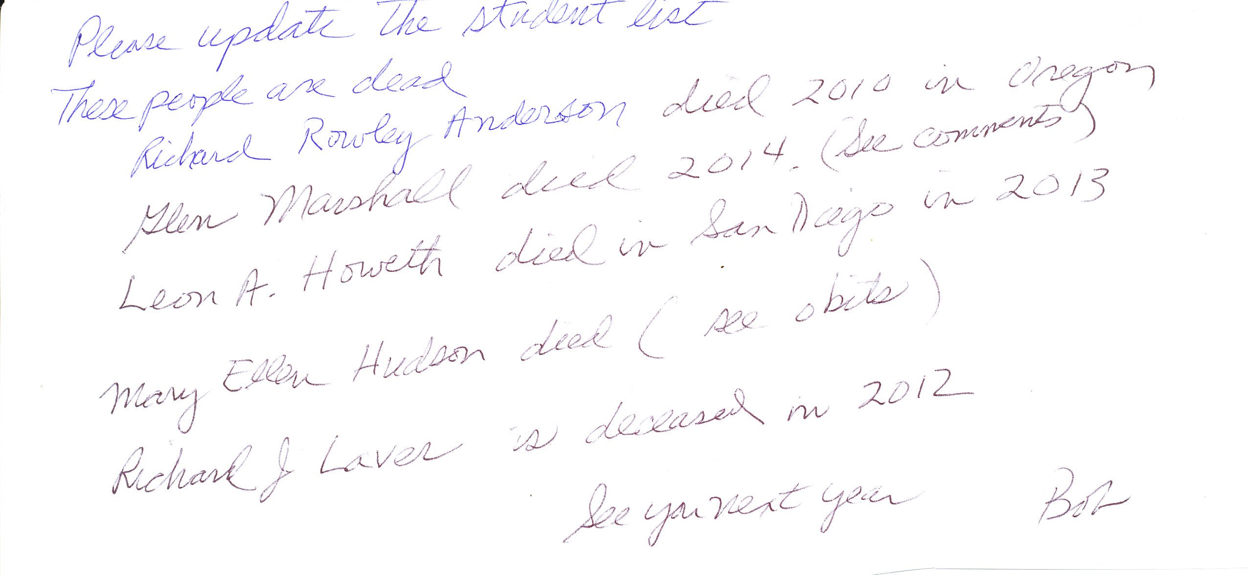 a note rec'd from a "Bob" postmarked in Santa Barbara Jan 4th 2015 - no return address or last name of "Bob", thanks Bob !